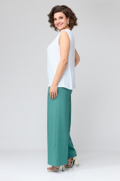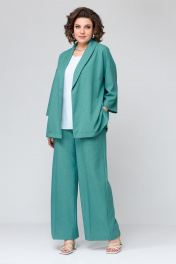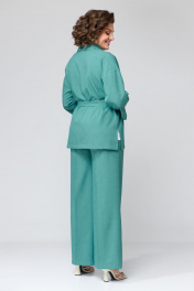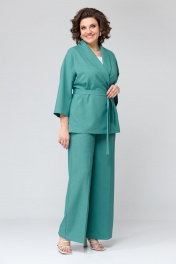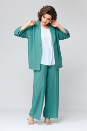 Комплект женский, трехпредметный, свободной формы, прямого силуэта, покроя спущенное плечо. Состоит из двубортного жакета на запах, брюк, прямых к низу и блузы без рукавов. Жакет: перед и спинка цельные, рукава прямые одношовные, длиной ¾. Горловина оформлена воротником «шаль», в боковых швах разрезы. На переде расположены нагрудные вытачки. К жакету прилагается пояс из основной ткани. Брюки: прямые, верхний срез обработан поясом с резинкой по спинке. В брюках имеются боковые наклонные карманы. На передних и задних половинках заутюжены стрелки. Блуза выполнена из вискозной блузочной ткани контрастного цвета. На переде расположены нагрудные вытачки. Блуза без рукавов. Горловина округлой формы. Жакет: Ширина изделия на уровне глубины: 50р – 55см, 52р – 57см, 54р – 59см, 56р – 61см, 58 – 63см, 60р – 65см. Ширина по линии бедер: 50р – 60см, 52р – 62см, 54р – 64см, 56р – 66см, 58р – 68см, 60р – 70см. Длина по среднему шву спинки: 50-54р – 72см, 56-60р – 73см. Ширина плеча: 50-54р – 23см, 56-60р – 25см. Длина рукава от горловины: 50р – 61см, 52р – 62см, 54р – 63см, 56р – 63см, 58р – 64см, 60р – 65см. Длина пояса: 50-54р – 160см, 56-60 – 170см. Ширина пояса: 3,5см. Брюки: Ширина по линии талии (без натяжения резинки): 50р – 40см, 52р – 42см, 54р – 44см, 56р – 46см, 58р – 48см, 60р – 50см. Ширина по линии бедер: 50р – 55см, 52р – 57см, 54р – 59см, 56р – 61см, 58р – 63см, 60р – 65см. Длина по боковому шву: 50-54р – 107см, 56-60 – 108см. Ширина брючины внизу: 50р – 32см, 52р – 33см, 54р – 34см, 56р – 34см, 58р – 35см, 60р – 36см. Высота посадки: 50-54р – 37см, 56-60р – 39см. Длина по внутреннему шву: 50-54р – 78см, 56-60р – 77см. Блуза: Ширина изделия на уровне глубины: 50р – 52см, 52р – 54см, 54р – 56см, 56р – 58см, 58 – 60см, 60р – 62см. Ширина по линии бедер: 50р – 58см, 52р – 62см, 54р – 62см, 56р – 64см, 58р – 66см, 60р – 68см. Длина по среднему шву спинки: 50-54р – 63см, 56-60 – 64см. Ширина плеча: 50-54р – 9,5см, 56-60р – 10,5см.