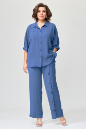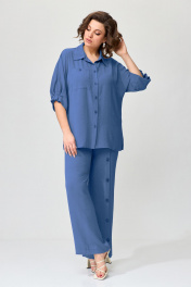 Комплект женский свободной формы, прямого силуэта. Покроя спущенное плечо. Блуза с центрально-бортовой застежкой на петли-пуговицы. Горловина оформлена стояче-отложным воротником с отрезной стойкой. Рукава цельнокроеные длиной до локтя. На переде расположены нагрудные вытачки и накладной карман. В боковых швах расположены разрезы. Спинка цельная. Брюки прямые. Верхний срез обработан поясом по спинке на резинке. На левой половине переда по центру расположены декоративные складки фиксирующиеся пуговицами. В боковых швах расположены карманы. Блуза: Ширина изделия на уровне глубины: 50р – 58см, 52р – 60см, 54р – 62см, 56р – 64см, 58 – 66см; Ширина по линии бедер: 50р – 60см, 52р – 62см, 54р – 64см, 56р – 66см, 58р – 88см; Ширина по линии талии: 50р – 55см, 57р – 53см, 54р – 59см, 56р – 61см, 58р – 63см; Длина по среднему шву спинки: 50-60р – 71см; Длина рукава от горловины: 50-60р – 49см. Брюки: Ширина по линии талии: 50р – 40см, 52р – 42см, 54р – 44см, 56р – 46см, 58р – 48см; Ширина по линии бедер: 50р – 55см, 52р – 57см, 54р – 59см, 56р – 61см, 58р – 63см; Длина по боковому шву:50-58р–109см; Ширина брючины внизу: 50р – 27см, 52р – 28см, 54р – 29см, 56р – 29см, 58р – 30см; Высота посадки: 50-54р – 38см, 56-59р – 39см; Длина по внутреннему шву: 50-58р – 79см.