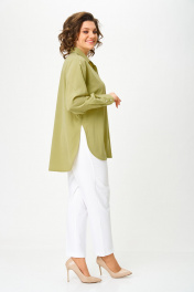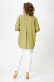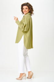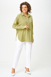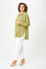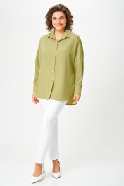 Комплект женский двухпредметный, состоит из рубашки и брюк. Рубашка свободной формы, покроя спущенное плечо с центрально бортовой застежкой на петли-пуговицы (отрезная планка). Горловина оформлена стояче отложным воротником с отрезной стойкой. Рукав одношовный, по низу со складкой и разрезом, обработанным фигурной планкой, рукав оформлен манжетой, застегивающейся на 2 пуговицы. В боковых швах расположены высокие разрезы закругленной формы. На спинке горизонтальная кокетка, на нижней части заложена встречная складка. Спинка длиннее, перед короче. Брюки классической формы к низу заужены. Верх брюк обработан поясом с обтачкой, по спинке в поясе расположена резинка. На поясе настрочены шлевки. В боковых швах расположена карманы закругленной формы. Брюки: Ширина по линии талии: 52р – 42см, 54р – 44см, 56р – 46см, 58р – 48см, 60р – 50см, 62р – 52см; Ширина по линии бедер: 52р – 56см, 54р – 58см, 56р – 60см, 58р – 62см, 60р – 64см, 62р – 66см; Длина по боковому шву: 52-62р – 100см; Ширина брючины внизу: 52р – 18см, 54р – 19см, 56р – 20см, 58р – 21см, 60р – 22см, 62р – 23см; Высота посадки:52-56р – 38см, 58-62р – 39,5см; Длина по внутреннему шву: 52-62р – 96см.