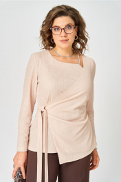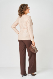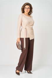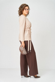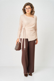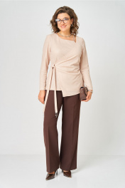 Комплект женский, состоящий из блузы трикотажного полотна с блеском и брюк из костюмной ткани. Блуза полуприлегающего силуэта. По переду отлетная деталь, идущая с левого плечевого шва, со складками в области талии и завязывающаяся на пояс, к концам которого пришита отделочная тесьма (стразы). По переду вырез ассиметричный, украшен декоративной тесьмой. На нижней части переда нагрудные вытачки, идущие из боковых швов. Рукав втачной, длинный. Брюки прямые, свободные. Верхний срез оформлен поясом, застегивающимся на петлю-пуговицу. На поясе шлевки, застежка с гульфиком на тесьму-молнию. В боковых швах выполнены наклонные карманы. На задней правой половинке брюк выполнен прорезной карман в рамку с петелькой и пуговицей отделочной (карман не функциональный). К комплекту прилагается пояс из основной ткани, к концам которого пришита отделочная тесьма со стразами. Блуза: Ширина изделия на уровне глубины: 48р – 50см, 50р – 52см, 52р – 54см, 54р – 56см, 56р – 58см, 58р – 60см; Ширина по линии талии: 48р – 45см, 50р – 47см, 52р – 49см, 54р – 51см, 56р – 53см, 58р – 55см; Ширина по линии бедер: 48р – 53см, 50р – 55см, 52р – 57см, 54р – 59см, 56р – 61см, 58р – 63см; Длина по среднему шву спинки: 48-52р – 63см, 54-58р – 65см; Ширина спинки: 48-52р – 37см, 54-58р – 39см; Ширина плеча: 48-52р – 10,5см, 54-58р – 12см; Ширина рукава под проймой: 48р – 17см, 50р – 18см, 52р – 19см, 54р – 19см, 56р – 20см, 58р – 21см; Длина рукава: 48-52р – 60см, 54-58р – 60см. Брюки: Ширина по линии талии (без натяжения резинки): 48р – 39см, 50р – 41см, 52р – 43см, 54р – 45см, 56р – 47см, 58р – 49см; Ширина по линии бедер: 48р –53см, 50р – 55см, 52р – 57см, 54р – 59см, 56р – 61см, 58р – 63см; Длина по боковому шву с поясом: 107см; Ширина брючины внизу: 48р –26см, 50р – 27см, 52р – 28см, 54р – 28см, 56р – 29см, 58р – 30см; Высота посадки: 48р-52р – 35см, 54-58р – 36см; Длина по внутреннему шву: 48р-52р – 82см, 54-58р – 81см.