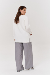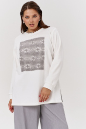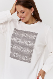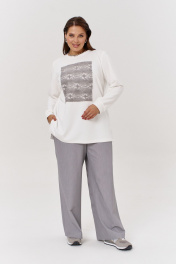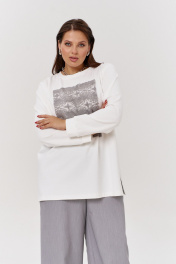 Джемпер свободного покроя с круглой горловиной. Рукав втачной, полномерный по обхвату, на манжете. По переду авторская вязаная аппликация шерстяным кружевом. Для удобства в боковых швах разрезы. Оригинальный джемпер oversize благодаря качественным лекалам хорошо садится по фигуре, не мнётся, удобен для повседневной носки и прекрасно выглядит! Ткань хорошо тянется и это позволяет вам комфортно себя чувствовать. Джемпер подойдет для прогулки, встречи с друзьями. Вы с удовольствием оцените крой и удобство этой модели.