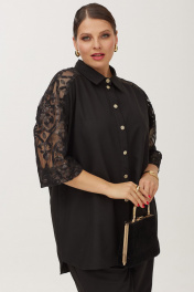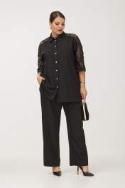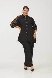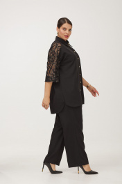 Стильный нарядный брючный костюм состоит из блузки и брюк. Блузка женская типа "рубашка", свободного силуэта, длиной ниже линии бедра, со вставкой из кружева на сетке с флоком (с блестящим напылением), по переду центральная застежка на петли-пуговицы. По спинке отрезная кокетка, от кокетки по центру заложена складка. Горловина оформлена рубашечным воротником со стойкой. Рукав кружевной, втачной, длина 3/4. Брюки женские классические, свободного силуэта, прямого кроя с высокой посадкой, с наклонными карманами в боковых швах, верхний срез оформлен поясом с эластичной резинкой. Внимание! Цветопередача фотографий может отличаться от реальности. Комплект представлен в двух вариантах: черный золотом(177) и черный с серебром (М177/1) Внимание! Цветопередача фотографий на Вашем устройстве может отличаться от реальности.