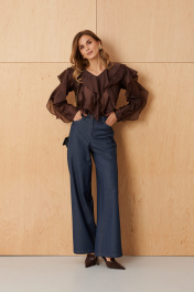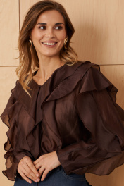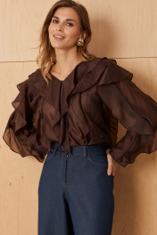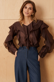 Женская блузка выполнена из легкой и воздушной вискозной ткани что придает ей приятную мягкость и комфорт в носке. Её шоколадный цвет делает его подходящим для повседневных ситуаций. Дизайн переда и спинки украшен двумя вертикальными рельефами, которые создают стройный силуэт и визуально удлиняют линию туловища. Внутри рельефов вставлены изящные воланы, добавляющие образу нотки романтики и женственности. Горловина V-образная обработана воланами, что придает мягкую изысканность и привлекательность. Длинные втачные рукава украшены воланами по линии проймы и вдоль рукава, создавая легкий объем и динамику движения. Такая отделка подчеркивает воздушность модели и делает ее особенно привлекательной. Эта блузка шоколадного оттенка идеально подойдет для повседневных образов — она сочетает комфорт, стиль и женственность, позволяя выглядеть элегантно в любой ситуации. 50 Блузка: Длина изделия - 66см, Длина рукава - 60см, Ширина плеча - 13.2см, Ширина по груди - 57.5см, Ширина по низу - 61.5см, Ширина рукава - 21.3см;
