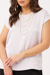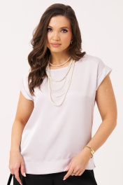 "Элегантная базовая блузка - неотъемлемая вещь офисного гардероба, которая пригодна для повседневной носки. Однотонная расцветка позволяет сочетать блузку с классическими черными или яркими брюками, джинсами и юбками. Блузка женская с коротким рукавом выглядит изящно благодаря мягкой ткани с характерным блеском. Она изготовлена из полиэстера и эластана - износоустойчивой и приятной на ощупь ткани, которая легко тянется и хорошо пропускает воздух. Блузка с коротким рукавом, вырезом горловины «лодочка» и аккуратно обработанным низом выполнена в прямом фасоне. Блузка женская в офис имеет неформальный вид, в отличие от традиционной одежды в деловом стиле. Проймы рукавов украшены отложными манжетами. Лаконичный дизайн позволяет носить различные аксессуары, жакеты и пиджаки, тем самым меняя повседневные образы. Блузка классическая женская представлена в базовых и ярких расцветках. Элегантная блузка - универсальная вещь, которую можно купить в качестве дополнения базового гардероба." 44 Блузка: Длина изделия - 58см, Ширина плеча - 16,5см, Ширина по груди - 50,5см, Ширина по низу - 52,5см, Ширина рукава - 20,2см;