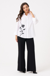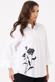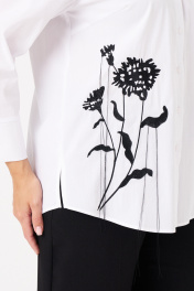 Это женская блузка из смесовой ткани с высоким содержанием хлопка, обеспечивающей комфорт и приятные тактильные ощущения. Модель выполнена с центральной застежкой, закрепленной на обметанных петлях и пуговицах, что придает ей классический и аккуратный вид. Перед украшен дизайнерской вышивкой в виде цветов, что добавляет изделию оригинальности и эстетической привлекательности. Перед имеет две нагрудные вытачки. Спинка с кокеткой и заложенными складками что делает данную блузку очень практичной и удобной. В боковых швах расположены небольшие разрезы, обеспечивающие свободу движений и удобство при носке. Горловина оформлена рубашечным воротником с отрезной стойкой, создавая структурированный и элегантный силуэт. Рукава втачные длинные, низ рукава обработан притачной манжетой, что делает дизайн завершенным и практичным. Эта блузка отлично подойдет для повседневных образов, сочетая комфорт, стиль и оригинальные декоративные элементы. 48 Блузка: Длина изделия - 71.5см, Длина переда от высшей плечевой точки до низа - 73см, Длина рукава - 51см, Обхват шеи - 47.5см, Ширина плеча - 14.5см, Ширина по груди - 55.5см, Ширина по низу - 61см, Ширина рукава - 21.5см; 50 Блузка: Длина изделия - 71.5см, Длина переда от высшей плечевой точки до низа - 73см, Длина рукава - 51см, Обхват шеи - 48.5см, Ширина плеча - 14.5см, Ширина по груди - 57.5см, Ширина по низу - 63см, Ширина рукава - 22.2см; 52 Блузка: Длина изделия - 72см, Длина переда от высшей плечевой точки до низа - 73.5см, Длина рукава - 51см, Обхват шеи - 49.5см, Ширина плеча - 14.8см, Ширина по груди - 59.5см, Ширина по низу - 65см, Ширина рукава - 23см; 54 Блузка: Длина изделия - 73см, Длина переда от высшей плечевой точки до низа - 74.5см, Длина рукава - 51см, Обхват шеи - 50.5см, Ширина плеча - 15см, Ширина по груди - 61.5см, Ширина по низу - 67см, Ширина рукава - 23.7см; 56 Блузка: Длина изделия - 73см, Длина переда от высшей плечевой точки до низа - 74.5см, Длина рукава - 52см, Обхват шеи - 51.5см, Ширина плеча - 15см, Ширина по груди - 63.5см, Ширина по низу - 69см, Ширина рукава - 24.5см; 58 Блузка: Длина изделия - 73.5см, Длина переда от высшей плечевой точки до низа - 75см, Длина рукава - 52см, Обхват шеи - 53см, Ширина плеча - 15.2см, Ширина по груди - 65.5см, Ширина по низу - 71см, Ширина рукава - 25.2см;