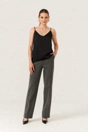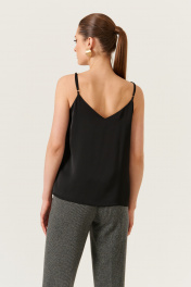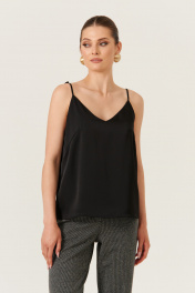 Эта женская блузка выполнена из легкой и мягкой струящейся ткани, идеально подходящей для повседневной носки. Модель обладает элегантным и нарядным внешним видом благодаря приятному блеску материала. Цвет блузки — классический черный, что делает ее универсальным элементом гардероба. Перед украшен двумя нагрудными вытачками, которые придают изделию аккуратную посадку и подчеркнут фигуру. Горловина выполнена в V-образной форме как по переду, так и по спинке, добавляя образу изящества и женственности. Блузка оснащена регулирующими бретелями, что позволяет настроить посадку по индивидуальным предпочтениям. Модель дополнена качественной вискозной подкладкой, обеспечивающей комфорт и аккуратность силуэта. Эта блузка станет отличным выбором для создания стильных повседневных образов с нотками элегантности и шарма. 46