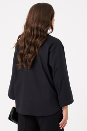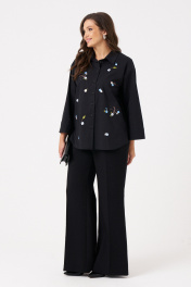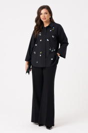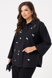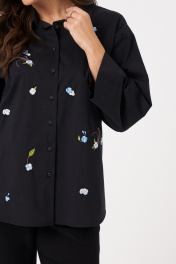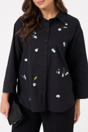 Это женская блузка чёрного оттенка из смесовой ткани с высоким содержанием хлопка, обеспечивающей комфорт и приятные тактильные ощущения. Модель выполнена с центральной бортовой застежкой, закрепленной на обметанных петлях и пуговицах, что придает ей классический и аккуратный вид. Перед украшен дизайнерской вышивкой в виде цветов, что добавляет изделию оригинальности и эстетической привлекательности. В боковых швах расположены небольшие разрезы, обеспечивающие свободу движений и удобство при носке. Горловина оформлена рубашечным воротником с отрезной стойкой, создавая структурированный и элегантный силуэт. Рукава втачные длинные, низ рукава обработан притачной манжетой, что делает дизайн завершенным и практичным. Эта блузка отлично подойдет для повседневных образов, сочетая комфорт, стиль и оригинальные декоративные элементы. 48 Блузка: Длина изделия - 68.5см, Длина рукава - 47.5см, Обхват шеи - 48см, Ширина плеча - 18см, Ширина по груди - 58.5см, Ширина по низу - 61.5см, Ширина рукава - 22.5см; 50 Блузка: Длина изделия - 68.5см, Длина рукава - 47.5см, Обхват шеи - 49см, Ширина плеча - 18.2см, Ширина по груди - 60.5см, Ширина по низу - 63.5см, Ширина рукава - 23см; 52 Блузка: Длина изделия - 69.5см, Длина рукава - 47.5см, Обхват шеи - 50.5см, Ширина плеча - 18.2см, Ширина по груди - 62.5см, Ширина по низу - 65.5см, Ширина рукава - 23.5см; 54 Блузка: Длина изделия - 70.5см, Длина рукава - 47.5см, Обхват шеи - 51см, Ширина плеча - 18.5см, Ширина по груди - 64.5см, Ширина по низу - 67.5см, Ширина рукава - 24см;