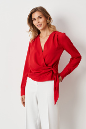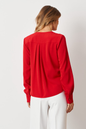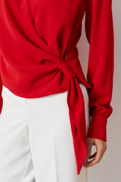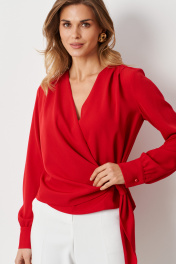Женская блузка из струящейся ткани чёрного цвета, идеально подходящая для повседневной носки. Модель выполнена на запах, что придаёт ей элегантность и удобство. Передняя часть украшена складками в плечевом шве, а также дополнительными складками, образующимися за счёт передней детали, продеваемой через перемычку. Спинка имеет отрезную кокетку и небольшие складки для комфортной посадки. Горловина V-образная, подчёркивающая линию шеи. Рукава втачные, длинные. Низ рукава оформлен притачной манжетой с застёжкой на обмётанную петлю и пуговицу, 48 Блузка: Длина изделия по спинке - 60см, Длина рукава - 64см, Ширина плеча - 11.8см, Ширина по груди - 56см, Ширина по низу - 60см, Ширина рукава вверху - 18см, Ширина рукава внизу - 12см, Ширина спинки - 39.6см; 50 Блузка: Длина изделия по спинке - 61см, Длина рукава - 64см, Ширина плеча - 12см, Ширина по груди - 58см, Ширина по низу - 62см, Ширина рукава вверху - 19см, Ширина рукава внизу - 12.3см, Ширина спинки - 40.5см; 52 Блузка: Длина изделия по спинке - 62см, Длина рукава - 64см, Ширина плеча - 12см, Ширина по груди - 60см, Ширина по низу - 64см, Ширина рукава вверху - 20см, Ширина рукава внизу - 12.5см, Ширина спинки - 41.2см;