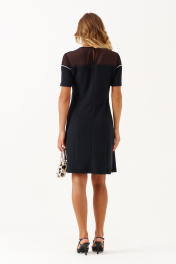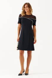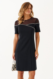 Женское платье миди из трикотажного полотна, чёрного цвета. Современное платье длиной миди сочетает в себе комфорт и стиль, идеально подходит как для повседневной носки, так и для особых случаев. Модель с полуприлегающим силуэтом обеспечивает свободу движений и комфорт благодаря чуть расширенной горловине. Особенный акцент ставит фигурный шов на передней части платья, украшенный декоративной тесьмой из бусин. Верхняя часть переда выполнена из элегантной сетки, которая красиво продолжается на рукавах. Вертикальные рельефы — два на переде и два на спинке — создают визуальную динамику и придают образу расслабленность. На спинке предусмотрен средний шов со скрытой молнией и кокеткой из сетки, дополненной застежкой «капелька» на пуговицу для удобства. Рукава длиной чуть выше локтя. Это универсальное чёрное платье станет стильной и практичной обновкой в любом гардеробе. 44 Платье: Длина изделия по спинке - 93см, Длина рукава - 26см, Ширина плеча - 11см, Ширина по бедрам - 49см, Ширина по груди - 46.5см, Ширина рукава вверху - 15.8см; 46 Платье: Длина изделия по спинке - 93см, Длина рукава - 26см, Ширина плеча - 11.1см, Ширина по бедрам - 51см, Ширина по груди - 48.5см, Ширина рукава вверху - 16.4см; 48 Платье: Длина изделия по спинке - 93см, Длина рукава - 26см, Ширина плеча - 11.2см, Ширина по бедрам - 53см, Ширина по груди - 50.5см, Ширина рукава вверху - 17см; 52 Платье: Длина изделия по спинке - 94см, Длина рукава - 26см, Ширина плеча - 11.4см, Ширина по бедрам - 57см, Ширина по груди - 54.5см, Ширина рукава вверху - 18.2см; 54 Платье: Длина изделия по спинке - 94см, Длина рукава - 26см, Ширина плеча - 11.5см, Ширина по бедрам - 59см, Ширина по груди - 56.5см, Ширина рукава вверху - 18.8см;