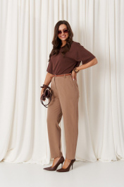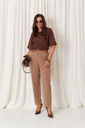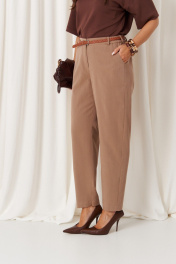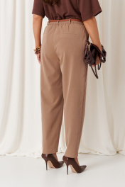 Данные женские брюки выполнены из мягкой вискозной ткани, что обеспечивает приятное ощущение и комфорт при носке. Верхний срез брюк оформлен притачным поясом, дополненным вставкой на резинке в задней и боковых частях, что позволяет добиться идеальной посадки и свободы движений. В задней части брюк расположены две талиевые вытачки, придающие форму и подчёркивающие линию талии. Задние карманы с листочками добавляют изделию эстетическую завершенность и функциональность, а боковой шов с карманом с подкройным бочком обеспечивает дополнительную практичность. Брюки заужены к низу, создавая современный и стройный силуэт. Застежка выполнена на крючок и молнию, расположенные в среднем шве, что обеспечивает удобство и надежность в использовании. В комплект входит пояс, который можно использовать для дополнения образа или для дополнительной регулировки посадки. Цвет брюк — капучино, универсальный и легко сочетаемый с другими предметами гардероба, делая их подходящим вариантом для повседневных и деловых образов. 46 Брюки: Высота посадки - 28см, Длина брюк с поясом - 103см, Длина по шаговому шву - 72.4см, Ширина по бедрам - 54см, Ширина по низу - 18.7см, Ширина по талии - 38см; 48 Брюки: Высота посадки - 28.5см, Длина брюк с поясом - 103см, Длина по шаговому шву - 72.3см, Ширина по бедрам - 56см, Ширина по низу - 19см, Ширина по талии - 40см; 50 Брюки: Высота посадки - 29см, Длина брюк с поясом - 103см, Длина по шаговому шву - 72.3см, Ширина по бедрам - 58см, Ширина по низу - 19.5см, Ширина по талии - 42см; 56 Брюки: Высота посадки - 29.5см, Длина брюк с поясом - 103см, Длина по шаговому шву - 71.5см, Ширина по бедрам - 64см, Ширина по низу - 20.4см, Ширина по талии - 48см;
