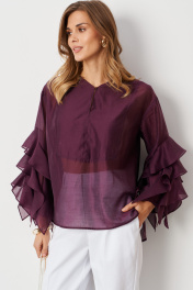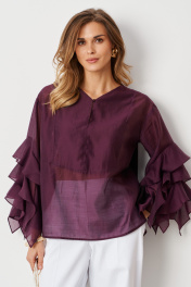 Эта женская блузка выполнена из мягкой и воздушной на ощупь ткани, в состав которой входит хлопок и вискоза. Блузка идеально подходящей для повседневной носки и для торжественных мероприятий. Модель обладает стильным кроем с декоративным подрезом и рельефами на передней части, что добавляет образу изящности и чуть романтичности. Передняя часть украшена средним швом, проходящим до подреза, создавая интересный визуальный эффект и структурированный силуэт. Спинка оформлена с кокеткой и двумя складками, что обеспечивает хорошую посадку и комфорт при движении. Горловина V-образная с застежкой-капелькой на одну пуговицу, что позволяет регулировать глубину и придает образу легкую небрежность. Втачные рукава украшены декоративными воланами, добавляющими женственности и изящества. Нижняя часть переда короче спинки, создавая эффект многослойности и динамичности силуэта. Баклажановый цвет делает эту блузку выразительной и универсальной для разных образов — от повседневных до чуть более официальных. Такая блузка отлично подойдет для сочетания с юбками, брюками или джинсами, создавая свежий и стильный городской образ. 44 Блузка: Длина изделия по спинке - 67см, Длина рукава - 46см, Ширина плеча - 15см, Ширина по груди - 56см, Ширина по низу - 58см, Ширина по талии - 56см, Ширина рукава вверху - 41см, Ширина рукава внизу - 41см;