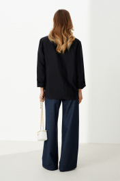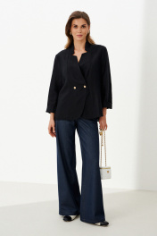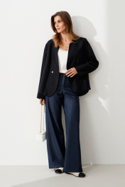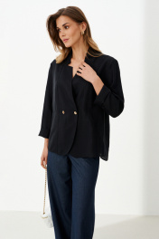 Женский жакет изготовлен из поливискозной струящейся ткани, что придает ему легкость и воздушность, идеально подходящую для повседневной носки. Модель обладает полуприлегающим силуэтом с комфортной посадкой, что обеспечивает удобство и подчеркивает фигуру, не стесняя движений. Застежка выполнена в двубортном стиле на аккуратные пуговицы с обметанными петлями, что добавляет классики и изящества изделию. Передняя часть жакета украшена вертикальными рельефами, плавно переходящими в стойку, которая визуально удлиняет и стройнит силуэт. В боковых швах предусмотрены небольшие разрезы, создающие дополнительную свободу движений и легкость образа. Горловина фигурная, что придает жакету элегантность и дополнительный комфорт при носке. Длинные втачные рукава завершают композицию, подчеркивая классический стиль модели. Черный цвет изделия делает его универсальным базовым элементом гардероба, который благодаря легкой и струящейся текстуре ткани напоминает блузку. Этот жакет отлично сочетается с различными элементами одежды, легко вписывается в разные стили и помогает создавать стильный и продуманный образ в любой ситуации — от работы до повседневных встреч. 44 Жакет: Длина изделия по спинке - 68см, Длина рукава - 60см, Ширина по груди - 54см, Ширина по низу - 57см, Ширина рукава вверху - 18.5см, Ширина рукава внизу - 15см; 46 Жакет: Длина изделия по спинке - 68см, Длина рукава - 60см, Ширина по груди - 56см, Ширина по низу - 59см, Ширина рукава вверху - 19см, Ширина рукава внизу - 15.3см; 48 Жакет: Длина изделия по спинке - 68см, Длина рукава - 60см, Ширина по груди - 58см, Ширина по низу - 61см, Ширина рукава вверху - 19.5см, Ширина рукава внизу - 15.6см; 50 Жакет: Длина изделия по спинке - 68см, Длина рукава - 60см, Ширина по груди - 60см, Ширина по низу - 63см, Ширина рукава вверху - 20см, Ширина рукава внизу - 15.8см; 52 Жакет: Длина изделия по спинке - 68см, Длина рукава - 60см, Ширина по груди - 62см, Ширина по низу - 65см, Ширина рукава вверху - 20.5см, Ширина рукава внизу - 16см;