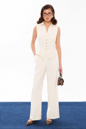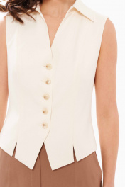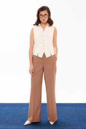 Жилетка женская из смесовой ткани полуприлегающего силуэта для повседневной и деловой носки. Застежка в жилете центральная бортовая на пять обметанных петель и пять пуговиц. Перед имеет два вертикальных рельефа идущих от линии плеча до низа изделия с небольшими разрезами к низу. Спинка имеет средний шов и два рельефа идущих от проймы до линии низа. Горловина обработана рубашечным воротником с отрезной стойкой. Жилет без рукавов. Жилет на поливискозной подкладке. Стильный жилет, который станет вашим любимцем, в нем вы будете чувствовать себя увереннее и привлекательнее. 44 Жилет: Длина изделия - 50.5см, Ширина плеча - 10.5см, Ширина по груди - 47см, Ширина по низу - 46см;