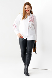 Стильная молодежная блузка с дизайнерской вышивкой по переду и по рукаву. Такая блузка отличный вариант как для офиса, так и на каждый день. Блузка полуприлегающего силуэта слегка расширенная к низу, по бокам имеются небольшие разрезы. Блузка с центральной сквозной застежкой на потайные петли и пуговицы и одну декоративную пуговицу на стойке воротника. По переду имеются нагрудные вытачки, по спинке имеется кокетка. Рукава длинные с манжетами. На манжетах имеются декоративные петли и пуговицы. Такая блузка отлично сочетается с различными брюками и джинсами создавая стильный современный образ. 54 Блузка: Длина изделия - 71,5см, Длина рукава - 61,5см, Обхват шеи - 46,5см, Ширина плеча - 12см, Ширина по груди - 60см, Ширина по низу - 67см, Ширина рукава - 20,7см;