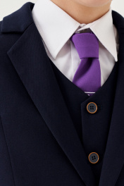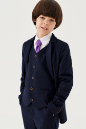 Строгий пиджак для мальчика из поливискозной ткани на вискозной подкладке. Пиджак полуприлегающего силуэта, удлиненный, с центральной застежкой на две петли и пуговицы до перегиба лацкана. Детали переда с отрезными бочками, передними вытачками и боковыми прорезными карманами с клапаном. На левом лацкане отделочная петля. Спинка со средним швом. Рукава втачные двухшовные,с настрочными налокотниками, локтевые швы заканчиваются декоративными шлицами. На шлицах по четыре отделочные петли и пуговицы. Воротник пиджачного типа с тупыми концами. Пиджак с притачной по низу подкладкой.