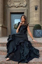 Магия черного цвета! И от этого платья невозможно отвести взгляд. Стильное черное платье – именно тот наряд, который должен быть у каждой представительницы прекрасного пола вне зависимости от возраста и особенностей внешности. Эффектные наряды всегда остаются в тренде благодаря своей универсальности. Они всегда выглядят стильно и притягательно. Разрезы на юбке, прикрытые шифоном, красиво раскрывающиеся при движении, интригуют и притягивают внимание. Они помогает продемонстрировать красоту ног, не обнажая их полностью, и поэтому смотрятся достаточно элегантно. Модель полуприталенного силуэта. Линия талии завышена, что визуально удлиняет ноги. Длина платья по спине 123 см.