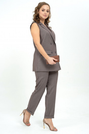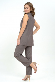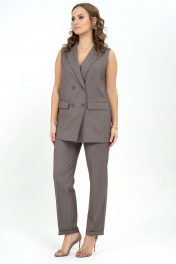 Костюм состоит из жилета и брюк. Жилет женский выполнен из костюмной ткани, перед на подкладке, прилегающего силуэта. Предназначен для повседневной носки. Жилет удлиненный, чуть ниже линии талии. Линия плеча естественная. Это придает более четкую форму плечевого пояса, и аккуратный вид всего изделия. Пройма неглубокая, умеренно широкая. По линии груди, талии и бедер изделие неплотно прилегает к фигуре. На переде обработаны прорезные карманы в рамку с клапаном. Нагрудная вытачка идет из плечевого среза и прячется за лацканом. Спинка со средним швом и рельефами, идущими от середины линии проймы до низа изделия. Воротник пиджачного типа. Борт смещенный застёгивается на 2 пуговицы и 2 декоративные. Брюки свободные, со стрелками, на передних половинках обработаны карманы с подрезным бочком, брюки застёгиваются на тесьму молнию, пояс – петлю, пуговицу. Задняя часть пояса собрана на эластичную тесьму. Низ брюк обработан манжетой. Длина жилета по спинке во всех размерах 72 см, ширина жилета на уровне глубины проймы в размере 42 - 48см, 44 - 49см, 46 - 50см, 48 - 52см, 50 - 54см, 52 - 56см, ширина брюк на уровне линии бёдер в размере 42 - 47см, 44 - 49см, 46 - 50см, 48 - 53см, 50 - 55см, 52 - 57см, длина брюк во всех размерах 103см.