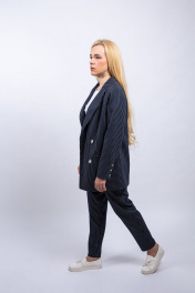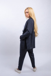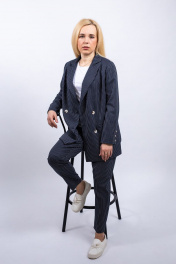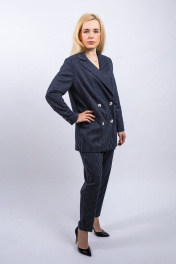 Костюм женский, состоящий из жакета и брюк. Жакет женский на подкладке,с плечевыми накладками, длиной ниже линии бедер. Перед с нагрудными вытачками, двумя прорезными карманами в рамку. Воротник пиджачного типа с острыми углами. Застежка центральная, двубортная. Рукава двухшовные, низ рукавов со шлицей, на 3 пуговицы. Брюки с притачным поясом. Передние части половин брюк с карманами в боковых швах, двумя скадками. Застежка на молнию в среднем шве. Пояс притачной со шлевками. Низ брюк подшит потайным стежком.
