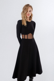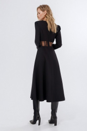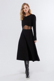 Облегающее платье длины миди из плотного трикотажа. Детали: прилегающий силуэт, линия талии с фигурной вставкой из полупрозрачной сетки, нагрудные и талиевые вытачки, рукава длинные со сборкой по окату, по низу рукавов застежка на потайную молнию, потайная застежка-молния по спинке Длина платья по спинке около 111 см, длина рукава около 62 см