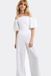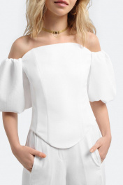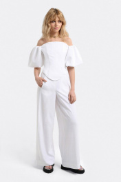 Текстильный костюм-двойка из топа-корсета и широких прямых брюк. Детали: топ прилегающего силуэта, перед и спинка с рельефными швами, рукава короткие пышные с резинкой, застежка на металлическую молнию в среднем шве спинки, фигурный низ, корсет на подкладке. Брюки с высокой посадкой и смещенными боковыми швами, пояс притачной на резинке, карманы в швах Длина топа по боковому шву около 24/25 см, длина рукава около 25 см; длина брюк с поясом около 109/110,5 см