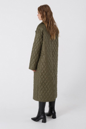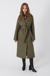 Однобортное стеганое пальто свободного покроя. Детали: прямой силуэт, спущенная линия плеча, пиджачный воротник, застежка на кнопки, рукава длинные, перед с прорезными карманами, спинка со средним швом и шлицей, пальто на подкладке, съемный пояс Длина по спинке около 112 см; длина рукава+ плечо около 51+11=62 см
