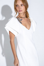 Текстильное платье с акцентными рукавами и глубоким V-образным вырезом. Детали: полуприлегающий силуэт, рельефные швы, потайная молния по спинке, шлица, платье на подкладке из 100% вискозы Длина от плечевого шва около 92 см в размерах 40-46 и около 96 см в размерах 48-52