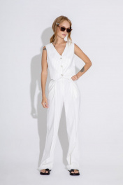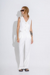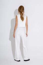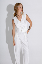 Текстильный костюм-двойка в полоску из укороченного жилета и прямых брюк-палаццо Детали: жилет полуприлегающего силуэта, талиевые вытачки, застежка на петли и пуговицы, функциональные карманы, жилет на подкладке из 100% вискозы. Брюки с высокой посадкой на притачном поясе со шлевками, застежка на молнию и пуговицу, боковые карманы, передние половины с заутюженными стрелками и двумя небольшими складками Длина жилета по спинке около 38 см в размерах 40-46 и около 41,5 см в размерах 48-52 Длина брюк по боковому шву с поясом около 113 см в размерах 40-46 и около 114,5 см в размерах 48-52, длина по внутреннему шву около 82 см