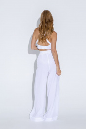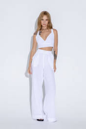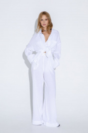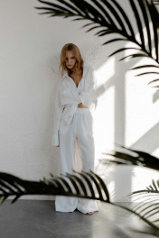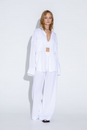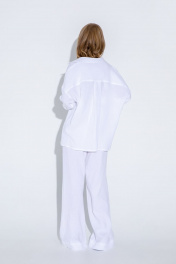 Костюм- тройка из свободной рубашки, топа- бюстье и широких брюк из облегченного хлопка Детали: рубашка прямого силуэта, спущенная линия плеча, накладные карманы, застежка на петли и пуговицы, удлиненные рукава с притачными манжетами. Топ без застежки, широкие бретели с резинками, сборка по низу чашки лифа, прилегание достигается за счет эластичных бретелей. Брюки прямого силуэта, притачной эластичный пояс, без застежки, перед с боковыми карманами Длина рубашки по спинке около 65 в размерах 40-46 и около 68 см в размерах 48-52 Длина рукава+ плечо около 51+11=62 см Длина топа от плечевого шва около 37 см в размерах 40-46 и около 39 см в размерах 48-52 Длина брюк по боковому шву с поясом около 108 в размерах 40-46 и около 109,5 см в размерах 48-52 Длина брюк по внутреннему шву около 80 см Состав: 100% хлопок
