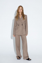 Классический приталенный жакет из текстильной ткани. Детали: жакет с отрезными бочками и нагрудными вытачками, пиджачный воротник, прорезные карманы, двубортная застежка на петли и пуговицы, спинка со средним швом, втачные двухшовные рукава, жакет на подкладке Длина по спинке около 68 в размерах 40-46 и около 71 см в размерах 48-52, длина рукавов около 61 см