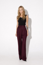 Текстильный костюм-тройка из трапециевидного жакета с высокой шлицей по спинке, полуприлегающего жилета и прямых брюк со стрелками. Детали: свободный покрой, пиджачный воротник, талиевые вытачки, функциональный нагрудный карман, прорезные карманы с клапанами, застежка на пуговицы, спинка со средним швом и высокой шлицей, рукава втачные двухшовные, жакет на подкладке. Жилет полуприлегающего силуэта, талиевые вытачками, застежка на петли и пуговицы, функциональные карманы, фигурный низ, на подкладке. Брюки с высокой посадкой на притачном поясе со шлевками, передние половины с небольшими застроченными мягкими складками и заутюженными стрелками, застежка на молнию и пуговицу, боковые карманы. Длина жакета по спинке около 74/76 см, длина рукава около 61 см; длина жилета по спинке около 48,5/51,5 см; длина брюк по боковому шву с поясом около 113/114,5 см