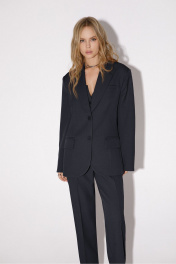 Текстильный костюм-двойка из оверсайз жакета и укороченных брюк со стрелками. Детали: жакет прямого силуэта, расширенная линия плеч, пиджачный воротник, перед с прорезными функциональными карманами, однобортная застежка на петли и пуговицы, спинка со средним швом и шлицей, рукава втачные двухшовные, на подкладке. Брюки с высокой посадкой на притачном поясе со шлевками, передние половины с небольшими застроченными мягкими складками и заутюженными стрелками, застежка на молнию и пуговицу, боковые карманы. Длина жакета по спинке около 69 см в размерах 40-46 и около 72 см в размерах 48-52, длина рукавов около 62 см. Длина брюк по боковому шву с поясом около 99/100,5 см, длина по внутреннему шву около 69,5 см.