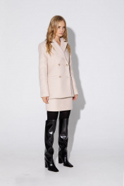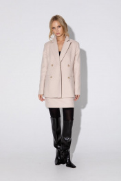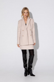 Костюм-двойка из двубортного жакета свободного покроя и прямой мини-юбки из утепленного текстиля. Детали: жакет прямого силуэта, пиджачный воротник, перед с прорезными функциональными карманами, застежка на петли и пуговицы, спинка со средним швом, рукава втачные двухшовные, на подкладке. Юбка с высокой посадкой, притачной пояс, застежка сзади на потайную молнию, на подкладке. Длина жакета по спинке около 70 см в размерах 40-46 и около 72 см в размерах 48-52, длина рукавов около 61 см. Длина юбки по боковому шву с поясом около 46 см в размерах 40-46 и около 49 см в размерах 48-52.