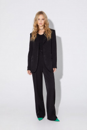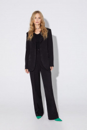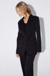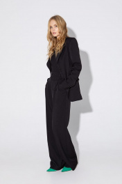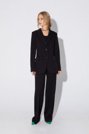 Костюм-двойка из полуприлегающего жакета со шлицами и широких брюк. Детали: пиджачный воротник, талиевые вытачки, перед с функциональным нагрудным карманом и двумя прорезными карманами, застежка на пуговицы, спинка со средним швом и шлицей, рукава втачные двухшовные со шлицами по низу, жакет на подкладке. Брюки с высокой посадкой на притачном поясе со шлевками, передние половины с небольшими застроченными мягкими складками и заутюженными стрелками, застежка на молнию и пуговицу, боковые карманы. Длина жакета по спинке около 69/72 см, длина рукава около 61см. Длина брюк по боковому шву с поясом около 113/114,5 см.