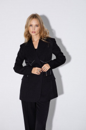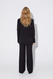 Текстильный костюм-двойка из жакета с декоративной отделкой и прямых брюк со стрелками. Детали: жакет полуприлегающего силуэта, рельефные швы, пиджачный воротник, функциональные карманы, втачные длинные рукава, двубортная застежка на петли и пуговицы, спинка со шлицей, жакет на подкладке. Брюки с высокой посадкой на притачном поясе со шлевками, передние половины с небольшими застроченными мягкими складками и заутюженными стрелками, застежка на молнию и пуговицу, боковые карманы. Длина по спинке около 70/73 см, длина рукава около 62 см; длина брюк по боковому шву с поясом около 113/114,5 см.