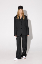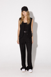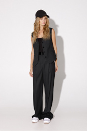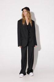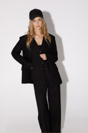 Текстильный костюм-тройка из оверсайз жакета, из полуприлегающего жилета и прямых брюк-палаццо со стрелками. Детали: жакет прямого силуэта, расширенная линия плеч, пиджачный воротник, перед с прорезными функциональными карманами, однобортная застежка на петли и пуговицы, спинка со средним швом и шлицей, рукава втачные двухшовные, жакет на подкладке. Жилет с талиевыми вытачками, застежка на петли и пуговицы, функциональные карманы, фигурный низ, на подкладке. Брюки с высокой посадкой на притачном поясе со шлевками, застежка на молнию и пуговицу, боковые карманы, передние половины с заутюженными стрелками и двумя небольшими складками. Длина жакета по спинке около 69 см в размерах 40-46 и около 72 см в размерах 48-52, длина рукавов около 62 см. Длина жилета по спинке около 48,5 см в размерах 40-46 и 51,5 см в размерах 48-52. Длина брюк по боковому шву с поясом около 113 см в размерах 40-46 и около 114,5 см в размерах 48-52, длина по внутреннему шву около 82 см.