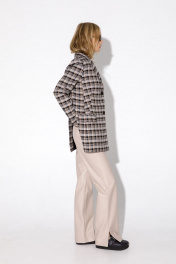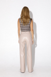 Комплект-тройка из трапециевидного жакета свободного покроя, укороченного жилета и прямых брюк из экокожи. Детали: пиджачный воротник, талиевые вытачки, перед с функциональным нагрудным и двумя прорезными карманами, застежка на пуговицы, спинка со средним швом и высокой шлицей, рукава втачные двухшовные, жакет на подкладке. Жилет прямого силуэта с фигурным низом, талиевые вытачки, застежка на петли и пуговицы, функциональные карманы, на подкладке. Брюки с высокой посадкой, прилегающий силуэт, притачной пояс со шлевками, застежка на молнию и пуговицу, перед с боковыми карманами, спинка с кокеткой и двумя накладными карманами, разрезы по низу боковых швов. Изнанка экокожи с небольшим ворсом. Длина жакета по спинке около 73 см в размерах 40-46 и около 75 см в размерах 48-52, длина рукава около 61 см. Длина жилета по спинке около 39 см в размерах 40-46 и около 43 см в размерах 48-52. Длина брюк по боковому шву с поясом около 110,5/112 см