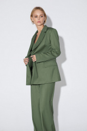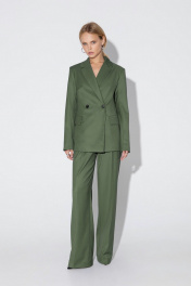 Текстильный костюм-двойка из двубортного полуприлегающего жакета и прямых брюк со стрелками. Детали: жакет с отрезными бочками и нагрудными вытачками, пиджачный воротник, прорезные карманы, застежка на петли и пуговицы, спинка со средним швом, втачные двухшовные рукава, жакет на подкладке. Брюки с высокой посадкой на притачном поясе со шлевками, передние половины с небольшими застроченными мягкими складками и заутюженными стрелками, застежка на молнию и пуговицу, боковые карманы. Длина жакета по спинке около 68/71 см, длина рукава около 61 см. Длина брюк по боковому шву с поясом около 113/114,5 см.