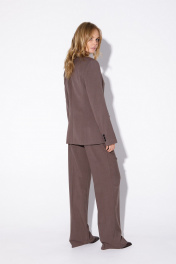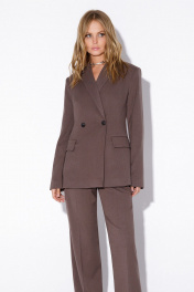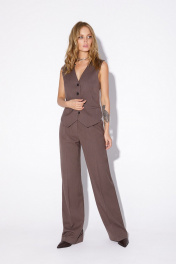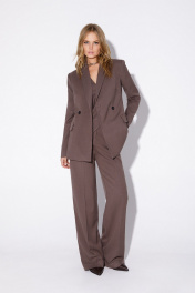 Текстильный костюм-тройка из двубортного полуприлегающего жакета, жилета и прямых брюк со стрелками. Детали: жакет с отрезными бочками и нагрудными вытачками, пиджачный воротник, прорезные карманы, застежка на петли и пуговицы, спинка со средним швом, втачные двухшовные рукава, жакет на подкладке. Жилет полуприлегающего силуэта, талиевые вытачками, застежка на петли и пуговицы, функциональные карманы, фигурный низ, на подкладке. Брюки с высокой посадкой на притачном поясе со шлевками, передние половины с небольшими застроченными мягкими складками и заутюженными стрелками, застежка на молнию и пуговицу, боковые карманы. Длина жакета по спинке около 68/71 см, длина рукава около 61 см. Длина жилета по спинке около 48,5/51,5 см. Длина брюк по боковому шву с поясом около 113/114,5 см.