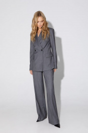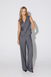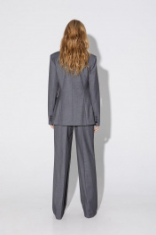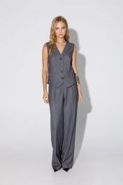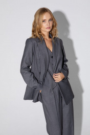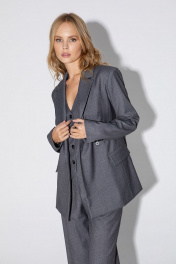 Текстильный костюм-тройка из двубортного полуприлегающего жакета, жилета и прямых брюк со стрелками. Детали: жакет с отрезными бочками и нагрудными вытачками, пиджачный воротник, прорезные карманы, застежка на петли и пуговицы, спинка со средним швом, втачные двухшовные рукава, жакет на подкладке. Жилет полуприлегающего силуэта, талиевые вытачками, застежка на петли и пуговицы, функциональные карманы, фигурный низ, на подкладке. Брюки с высокой посадкой на притачном поясе со шлевками, передние половины с небольшими застроченными мягкими складками и заутюженными стрелками, застежка на молнию и пуговицу, боковые карманы. Длина жакета по спинке около 68/71 см, длина рукава около 61 см. Длина жилета по спинке около 48,5/51,5 см. Длина брюк по боковому шву с поясом около 113/114,5 см.