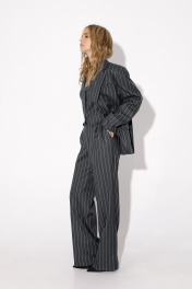 Текстильный костюм-тройка из оверсайз жакета, укороченного жилета и прямых брюк-палаццо со стрелками. Детали: жакет прямого силуэта, расширенная линия плеч, пиджачный воротник, перед с прорезными функциональными карманами, однобортная застежка на петли и пуговицы, спинка со средним швом и шлицей, рукава втачные двухшовные, жакет на подкладке. Жилет прямого силуэта с фигурным низом, талиевые вытачки, застежка на петли и пуговицы, функциональные карманы, на подкладке. Брюки с высокой посадкой на притачном поясе со шлевками, застежка на молнию и пуговицу, боковые карманы, передние половины с заутюженными стрелками и двумя небольшими складками. Длина жакета по спинке около 69 см в размерах 40-46 и около 72 см в размерах 48-52, длина рукавов около 62 см. Длина жилета по спинке около 39 см в размерах 40-46 и около 43 см в размерах 48-52. Длина брюк по боковому шву с поясом около 113 см в размерах 40-46 и около 114,5 см в размерах 48-52, длина по внутреннему шву около 82 см.