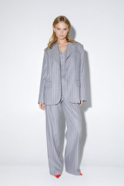 Текстильный костюм-тройка из оверсайз жакета, укороченного жилета и прямых брюк-палаццо со стрелками. Детали: жакет прямого силуэта, расширенная линия плеч, пиджачный воротник, перед с прорезными функциональными карманами, однобортная застежка на петли и пуговицы, спинка со средним швом и шлицей, рукава втачные двухшовные, жакет на подкладке. Жилет прямого силуэта с фигурным низом, талиевые вытачки, застежка на петли и пуговицы, функциональные карманы, на подкладке. Брюки с высокой посадкой на притачном поясе со шлевками, застежка на молнию и пуговицу, боковые карманы, передние половины с заутюженными стрелками и двумя небольшими складками. Длина жакета по спинке около 69 см в размерах 40-46 и около 72 см в размерах 48-52, длина рукавов около 62 см. Длина жилета по спинке около 39 см в размерах 40-46 и около 43 см в размерах 48-52. Длина брюк по боковому шву с поясом около 113 см в размерах 40-46 и около 114,5 см в размерах 48-52, длина по внутреннему шву около 82 см.