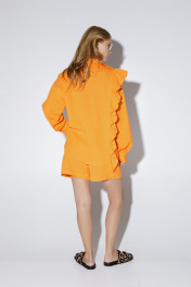 Костюм-двойка из свободной рубашки с воланом и коротких шорт из фактурного хлопка. Детали: рубашка прямого силуэта, спущенная линия плеча, накладной карман, застежка на петли и пуговицы, длинные рукава с притачными манжетами. Шорты с высокой посадкой, притачной эластичный пояс, без застежки, перед с боковыми карманами. Длина рубашки по спинке около 70 см в размерах 40-46 и около 74 см в размерах 48-52, длина рукава+ плечо около 53+9=62 см. Длина шорт по боковому шву с поясом около 41 см в размерах 40-46 и около 44 см в размерах 48-52. Длина шорт по внутреннему шву около 13 см в размерах 40-46 и около 15 см в размерах 48-52