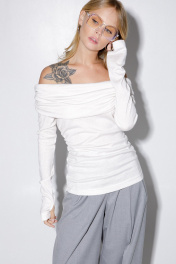 Трикотажный джемпер с открытыми плечами. Детали: джемпер прилегающего силуэта, длинные рукава с прорезями для пальцев, боковые швы со сборкой.