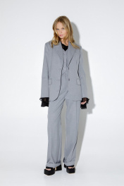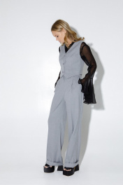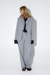 Костюм-тройка из оверсайз жакета, укороченного жилета и прямых широких брюк со стрелками из текстильной ткани. Детали: жакет прямого силуэта, расширенная линия плеч, пиджачный воротник, перед с прорезными функциональными карманами, однобортная застежка на петли и пуговицы, спинка со средним швом и шлицей, рукава втачные двухшовные, жакет на подкладке. Жилет прямого силуэта с фигурным низом, талиевые вытачки, застежка на петли и пуговицы, функциональные карманы, на подкладке. Брюки с высокой посадкой на притачном поясе со шлевками, пояс прямой без резинки, застежка на молнию и пуговицу, боковые карманы, передние половины с заутюженными стрелками и двумя небольшими складками. Задние части брюк с вытачками и заутюженными стрелками. Длина жакета по спинке около 69 см в размерах 40-46 и около 72 см в размерах 48-52, длина рукавов около 62 см. Длина жилета по спинке около 39 см в размерах 40-46 и около 43 см в размерах 48-52. Длина брюк по боковому шву с поясом около 113 см в размерах 40-46 и около 114,5 см в размерах 48-52, длина по внутреннему шву около 82 см