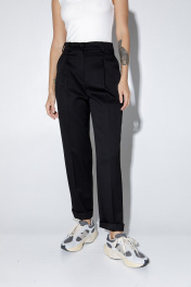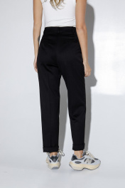 Комплект-двойка из трикотажного джемпера с открытыми плечами и текстильных укороченных брюк. Детали: джемпер прилегающего силуэта, длинные рукава с прорезями для пальцев, боковые швы со сборкой. Брюки с притачным поясом со шлевками, прямой пояс без резинки, застежка на молнию и пуговицу, боковые карманы. Задние части брюк с вытачками и имитацией карманов. Длина брюк по боковому шву с поясом около 99 см в размерах 40-46 и около 100,5 см в размерах 48-50, длина по внутреннему шву около 69,5 см.