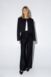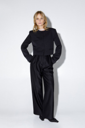 Укороченный жакет из текстильной ткани со стразами. Детали: жакет прямого силуэта, расширенная линия плеч, талиевые вытачки, перед с прорезными функциональными карманами, однобортная застежка на петли и пуговицы, спинка со средним швом, рукава втачные двухшовные, на подкладке. Длина по спинке около 44 см в размерах 40-46 и около 46 см в размерах 48-52, длина рукавов около 62 см.