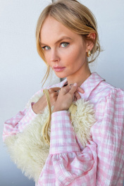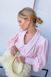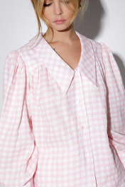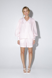 Хлопковый костюм-двойка из свободной блузы с акцентным воротником и коротких шорт. Детали: блуза трапециевидного силуэта, отложной воротник, кокетка переда и спинки, застежка на петли и декоративные пуговицы, рукава пышные с высокими манжетами. Шорты с высокой посадкой, притачной эластичный пояс, без застежки, перед с боковыми карманами. Длина блузы по спинке около 61 см в размерах 40-46 и около 64 см в размерах 48-52, длина рукавов около 65 см. Длина шорт по боковому шву с поясом около 41 см в размерах 40-46 и около 44 см в размерах 48-52, длина шорт по внутреннему шву около 13 см в размерах 40-46 и около 15 см в размерах 48-52