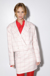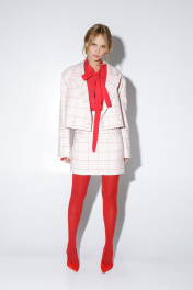 Костюм-двойка из укороченного оверсайз жакета с расширенными плечами и мини-юбки с высокой посадкой. Детали: прямой силуэт, спущенная линия плеча, пиджачный воротник, перед с функциональным нагрудным карманом, застежка двубортная на петли и пуговицы, рукава втачные двухшовные, жакет на подкладке. Юбка на притачном поясе, талиевые вытачки, застежка сзади на потайную молнию, юбка на подкладке. Длина жакета по спинке около 47 см в размерах 40-46 и около 49 см в размерах 48-52, длина рукава около 60см. Длина юбки по боковому шву с поясом около 46 см в размерах 40-46 и около 49 см в размерах 48-52 см