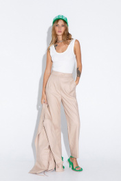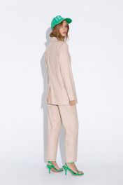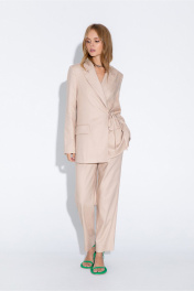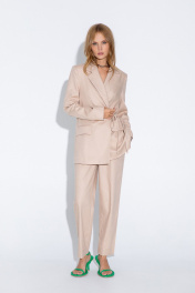 Льняной костюм-тройка из свободного прямого жакета с завязками, укороченных свободных брюк со складками и трикотажной базовой майки. Детали: жакет прямого силуэта, отрезные бочки, пиджачный воротник, застежка-завязки, функциональные карманы, рукава и спинка со шлицами, жакет на подкладке из 100% вискозы. Майка из трикотажа «лапша» прилегающего силуэта, глубокие вырезы горловины и пройм. Брюки с высокой посадкой, притачной пояс со шлевками, задняя часть пояса эластичная- с резинкой, застежка на молнию и пуговицу, боковые карманы, передние половины с двумя складками. Длина жакета по спинке около 71 см в размерах 40-46 и около 75 см в размерах 48-52, длина рукавов около 62 см. Длина майки от плечевого шва около 37 см в размерах 40-46 и около 39 см в размерах 48- 52 Длина брюк по боковому шву с поясом около 99,5 см в размерах 40-46 и около 101 см в размерах 48- 52, длина по внутреннему шву около 70 см.