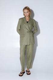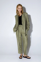 Льняной костюм-тройка из свободного прямого жакета с завязками, укороченных свободных брюк со складками и трикотажной базовой майки. Детали: жакет прямого силуэта, отрезные бочки, пиджачный воротник, застежка-завязки, функциональные карманы, рукава и спинка со шлицами, жакет на подкладке из 100% вискозы. Майка из трикотажа «лапша» прилегающего силуэта, глубокие вырезы горловины и пройм. Брюки с высокой посадкой, притачной пояс со шлевками, задняя часть пояса эластичная- с резинкой, застежка на молнию и пуговицу, боковые карманы, передние половины с двумя складками. Длина жакета по спинке около 71 см в размерах 40-46 и около 75 см в размерах 48-52, длина рукавов около 62 см. Длина майки от плечевого шва около 37 см в размерах 40-46 и около 39 см в размерах 48- 52 Длина брюк по боковому шву с поясом около 99,5 см в размерах 40-46 и около 101 см в размерах 48- 52, длина по внутреннему шву около 70 см.